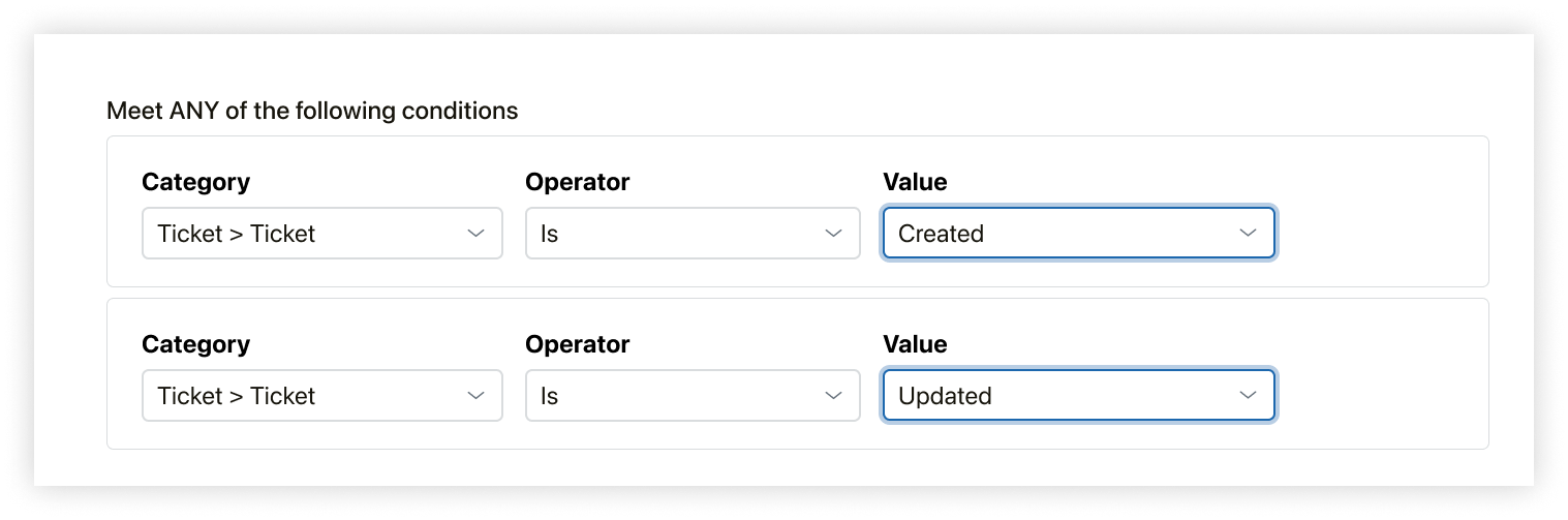 - A trigger with the condition Ticket > Ticket | Is | Created fires when a new ticket arrives in your account.