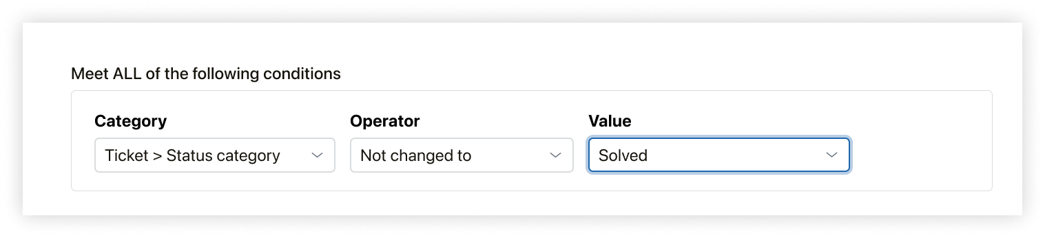 - Add the condition Object > Ticket > Status category | Not changed to | Solved to prevent a solved status from firing the trigger.