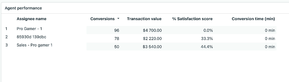 The Goal conversions tab can help you determine whether your agents are meeting conversion goals through their messaging conversations, how satisfied users are with those interactions, and more. You can filter most metrics and reports by time, specific goal name, ticket group, and assignee name.