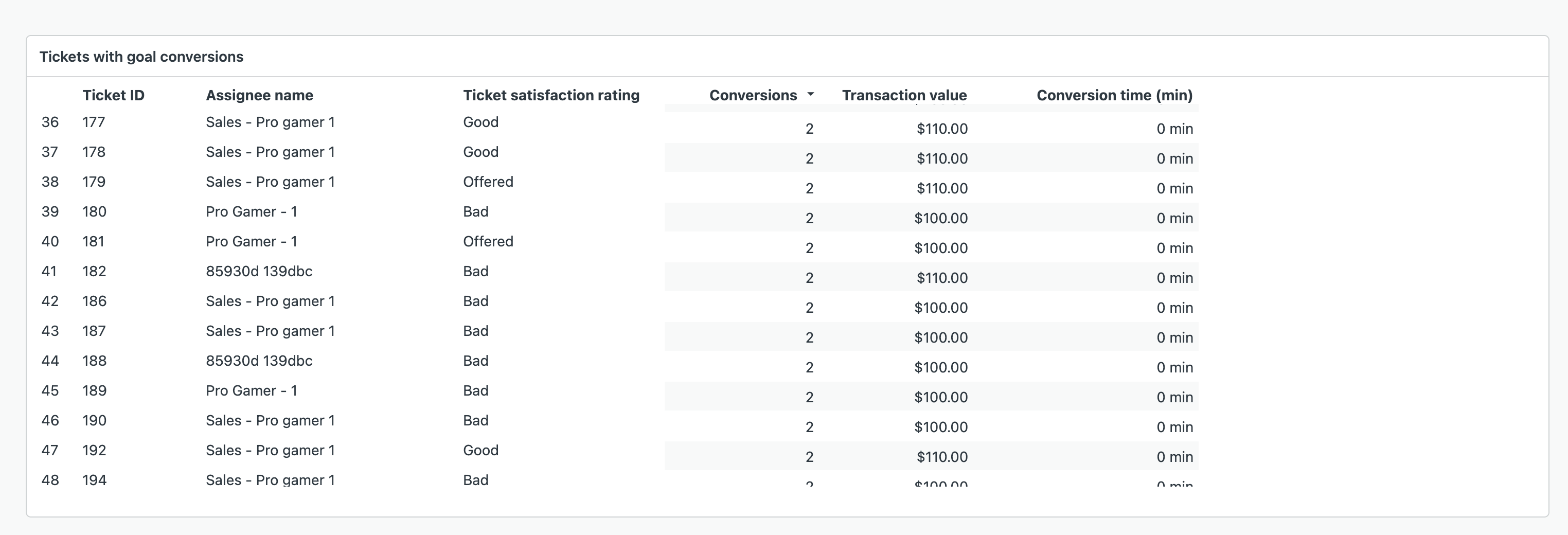 Conversion time: Average number (in minutes) from ticket creation to first goal conversion.