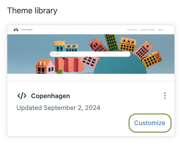 - Find the newly-created Copenhagen theme that appears in the Theme Library, and click Customize
