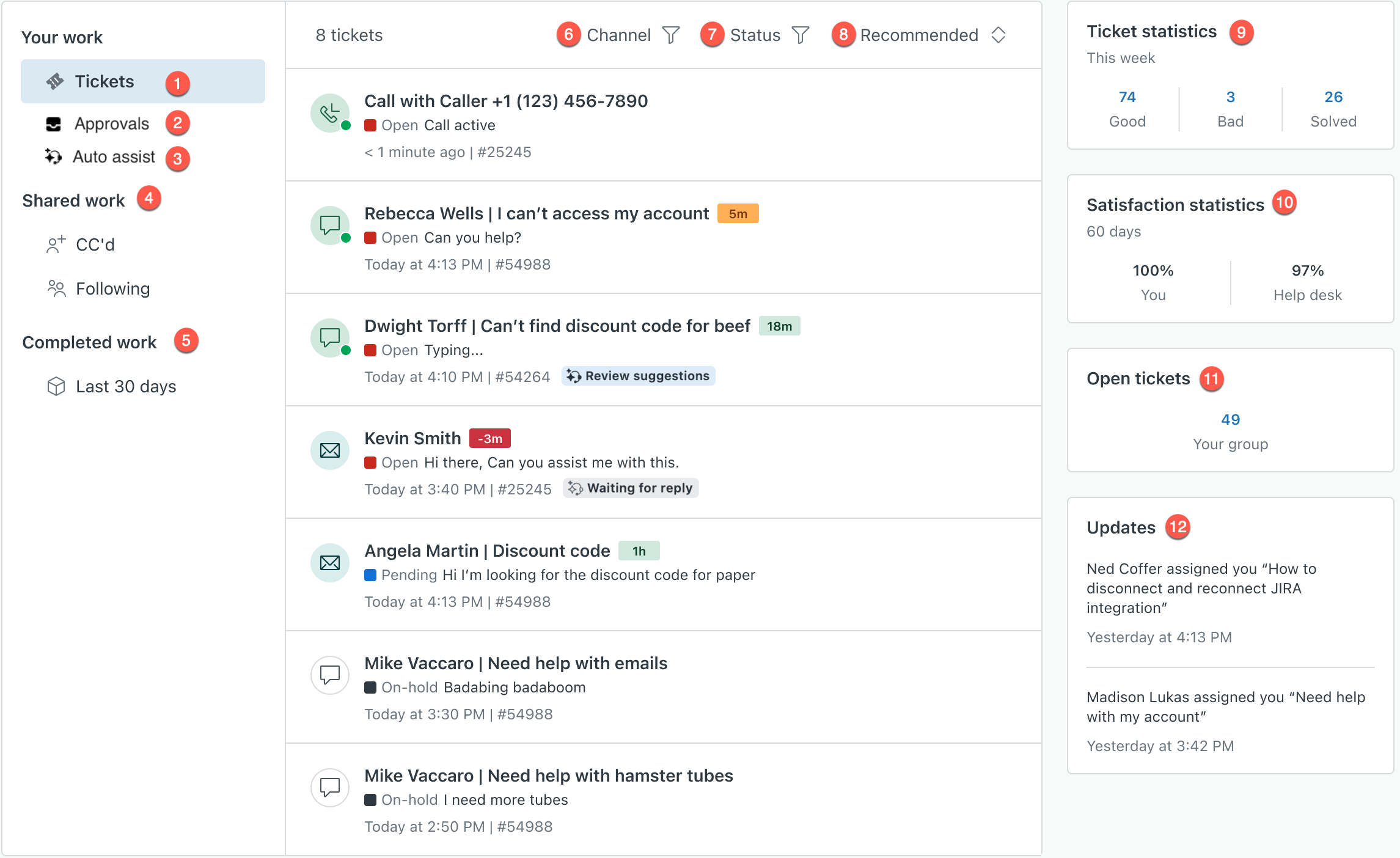 - Completed work > Last 30 days: Work you completed recently (last 30 days). This includes tickets with a solved, closed, or archived status and side conversations marked as done.