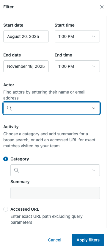 - Enter a name or email address in the Actor field to filter by the people or systems responsible for the access events.