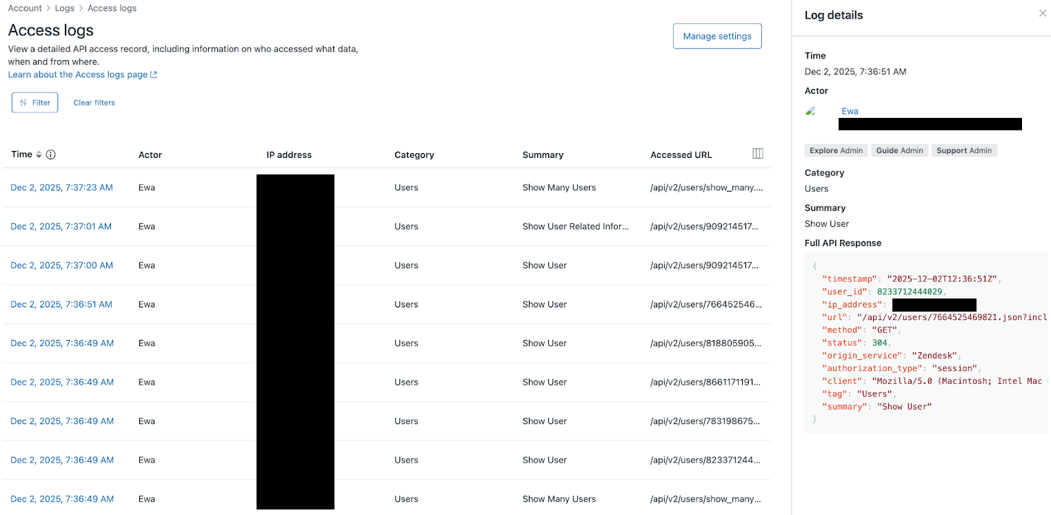 Before you can view access logs, you must turn on the Access Log API in Admin Center. When you do, Zendesk begins capturing access events. Access events that occurred before you turned on the API aren't captured.