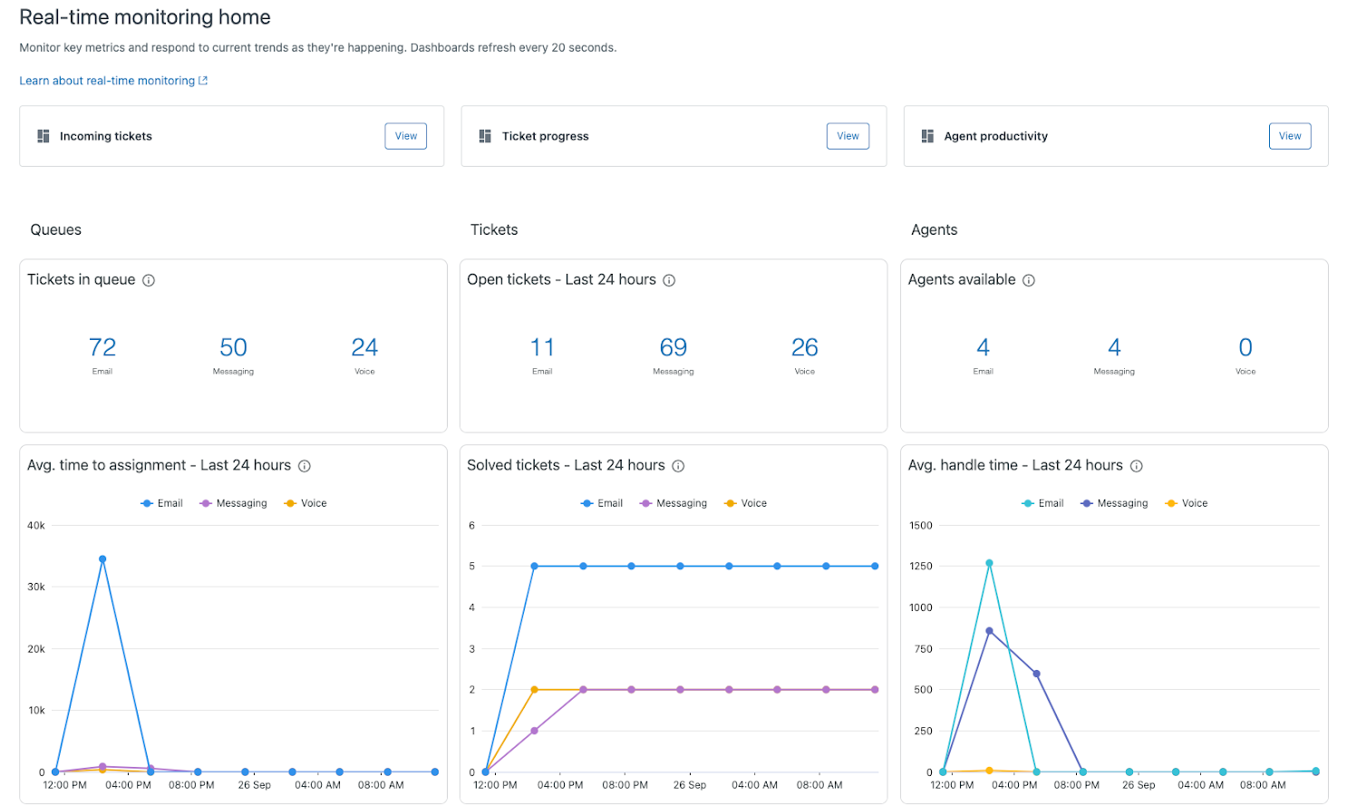 - Incoming tickets: Recent history metrics to monitor omnichannel routing queue performance over time and spot trends.