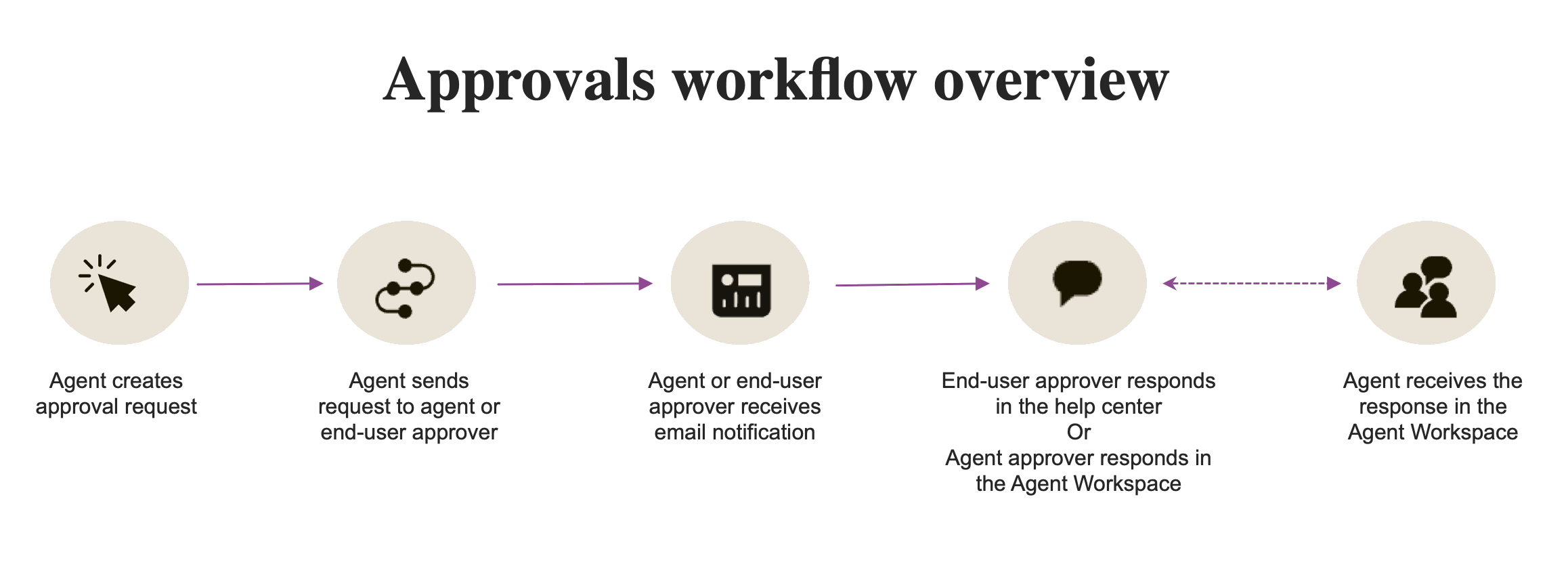 Approvals are requests that agents make on behalf of other agents and end users. Agents send requests to approvers. Approvers are other agents or end users who have the authority to review the request information and make a decision. Approvers might receive approval requests for various things, such as processing refunds or software access. Pending approval requests prevent tickets from being closed. You need a Customer Services Suite Professional plan or above or an Employee Services Growth plan or above to use approval requests.