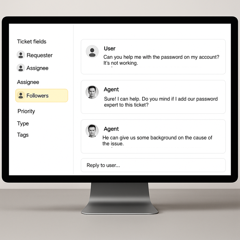 Agents can add CCs and followers to tickets. Followers allow agents to include additional internal users (agents or administrators) on ticket notifications. They might do this if they want someone else to be aware of a ticket or provide some feedback on it.