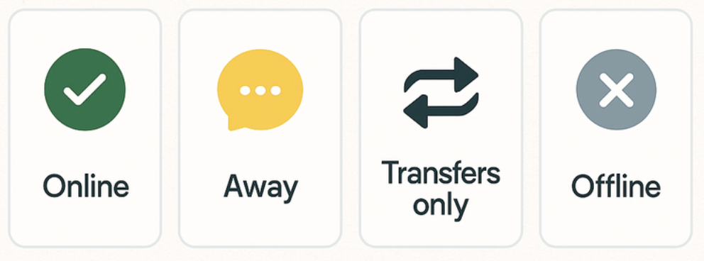 Unified agent status allows agents to control availability for email, voice, and messaging from a single menu. There are four standard agent statuses: online, away, transfers only, and offline.