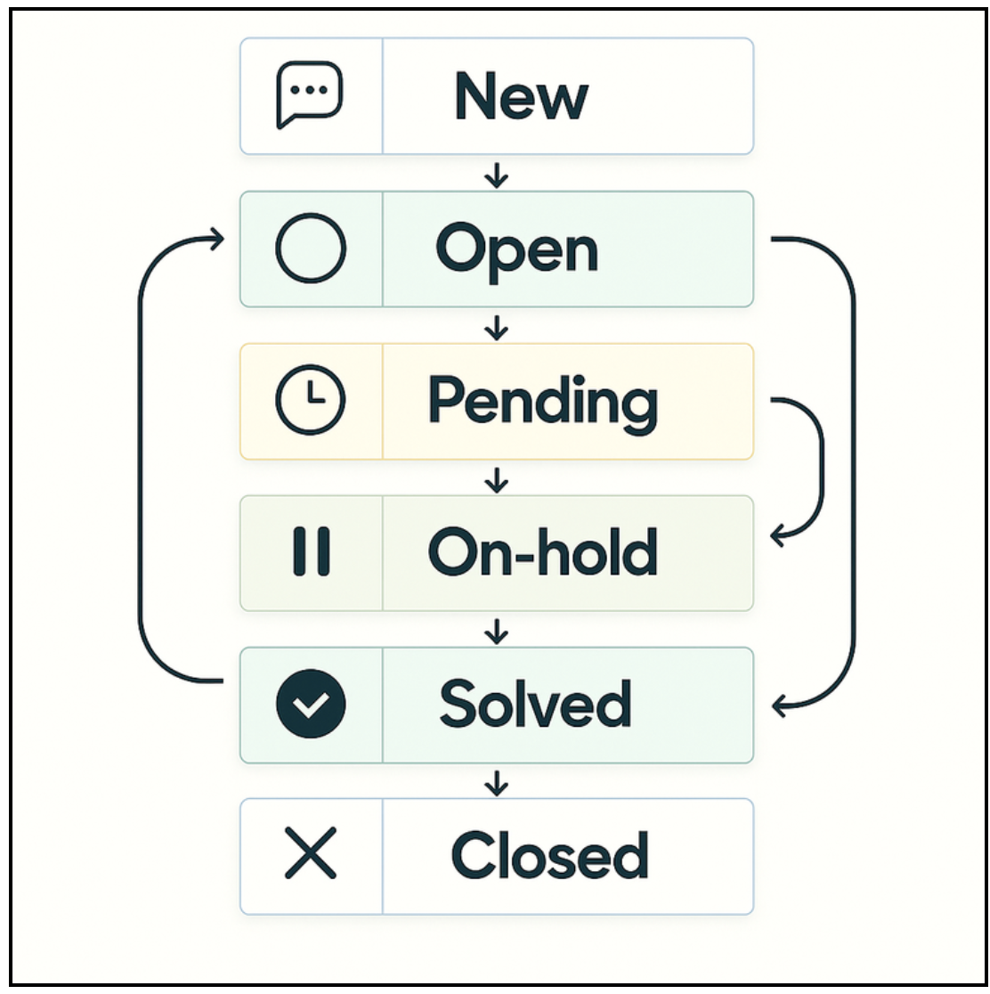 A ticket's lifetime is based on its status. A ticket moved from New to Open, can be set aside as Pending or On-hold, and hopefully becomes Solved quickly. Tickets can flow between statuses and can go from Pending to Open, and vice versa.