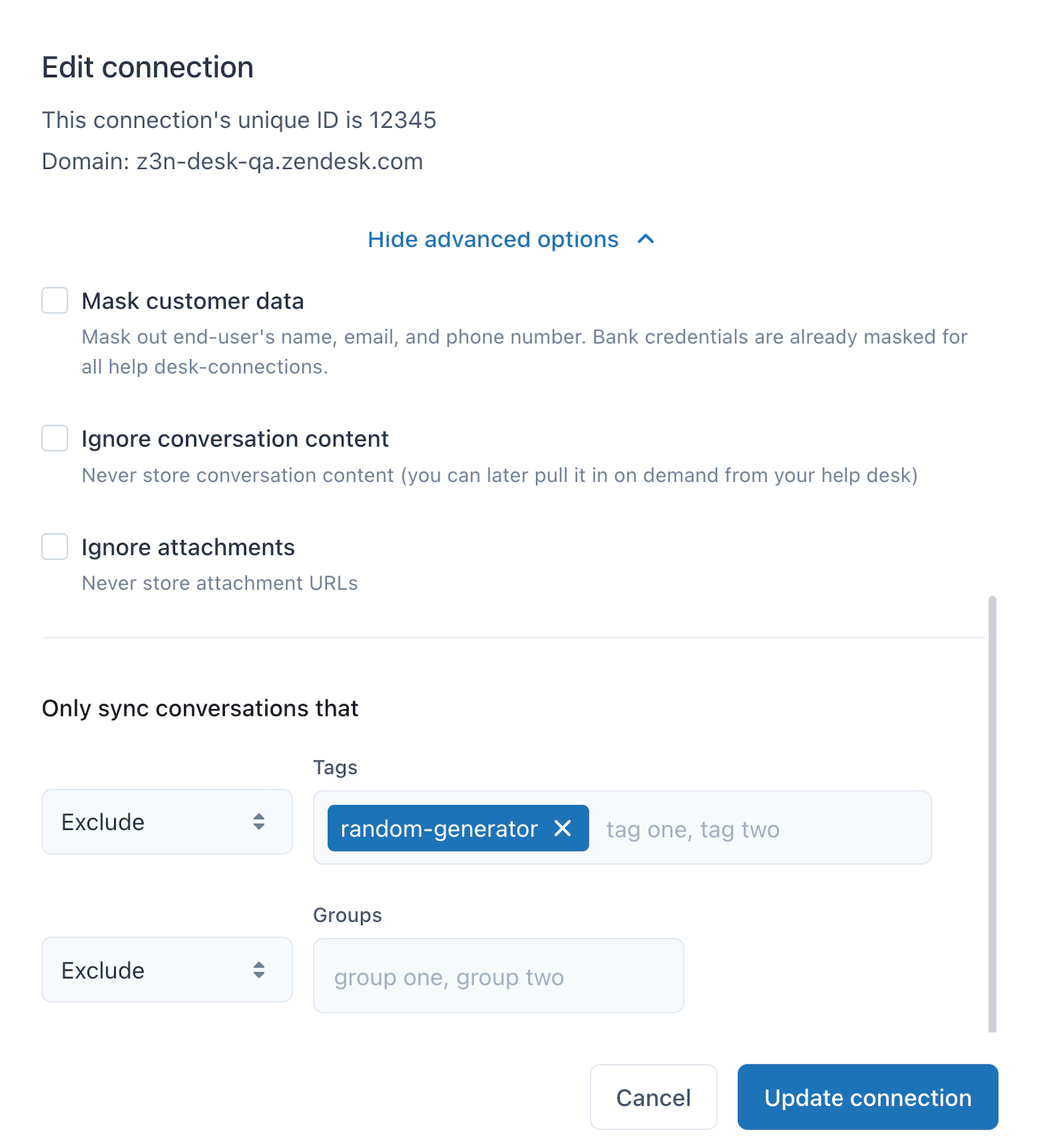 - Only sync conversations that: Enter the names of the ticket tags and groups you want to include or exclude from syncing into Zendesk QA. Tags are not case-sensitive.