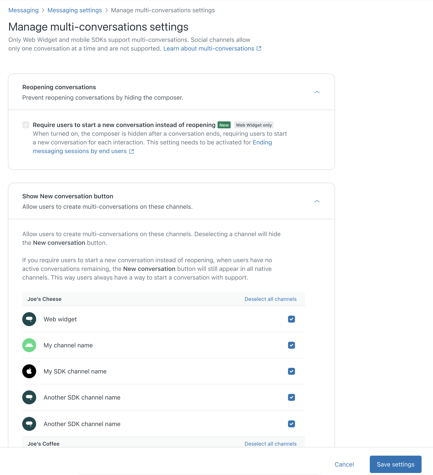Note: Turning on multi-conversations for one messaging channel updates all web, iOS, and Android messaging channels. Any channels not selected during this step perform as described in Removing the New conversation button. - Click Save settings.