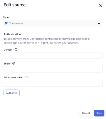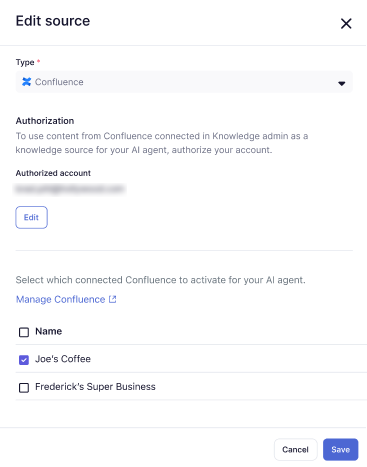 Confluence connections are created and managed in Knowledge. You must create a Confluence connection in Knowledge before you can connect a Confluence site or space to your advanced AI agent.