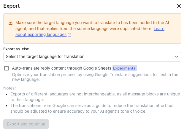 translations for.For example, if you've already created replies in English and now you want to add German translations, you would select German.Note: Exports of different languages are not interchangeable, as all message blocks are unique to their language.
