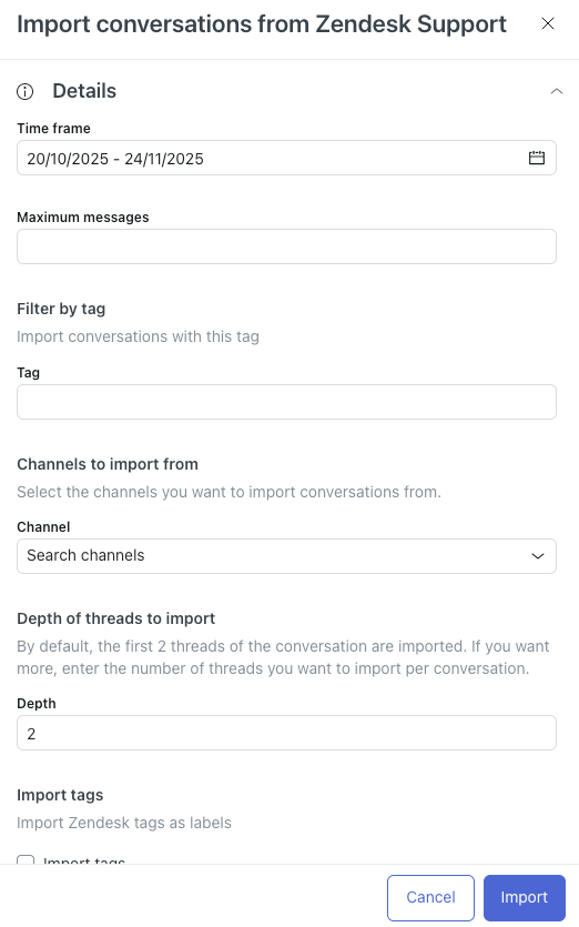 - (Optional) Select Import tags to import any tags on the ticket in Zendesk Support as labels on the conversation in AI agents - Advanced.