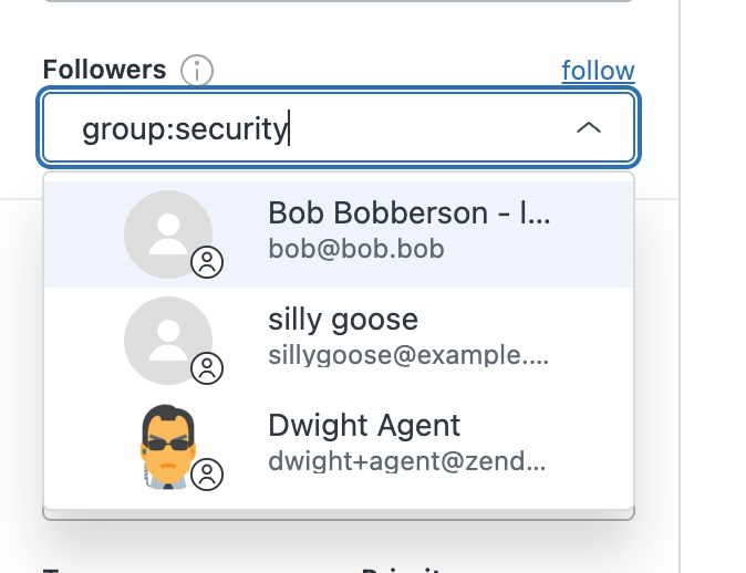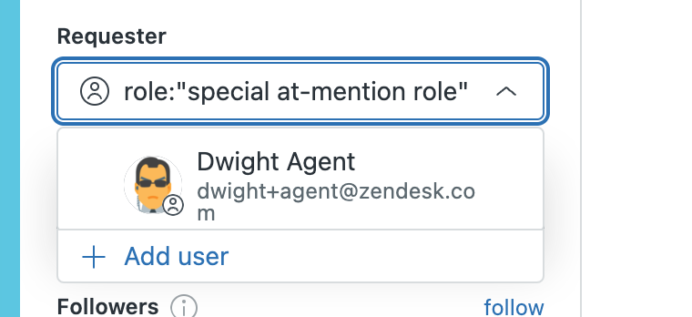The Requester, Follower, and CC fields let you search with advanced search options. You can filter results by user property keywords by enclosing property keywords in quotes when searching. To better understand how to perform those searches, see the examples below.
