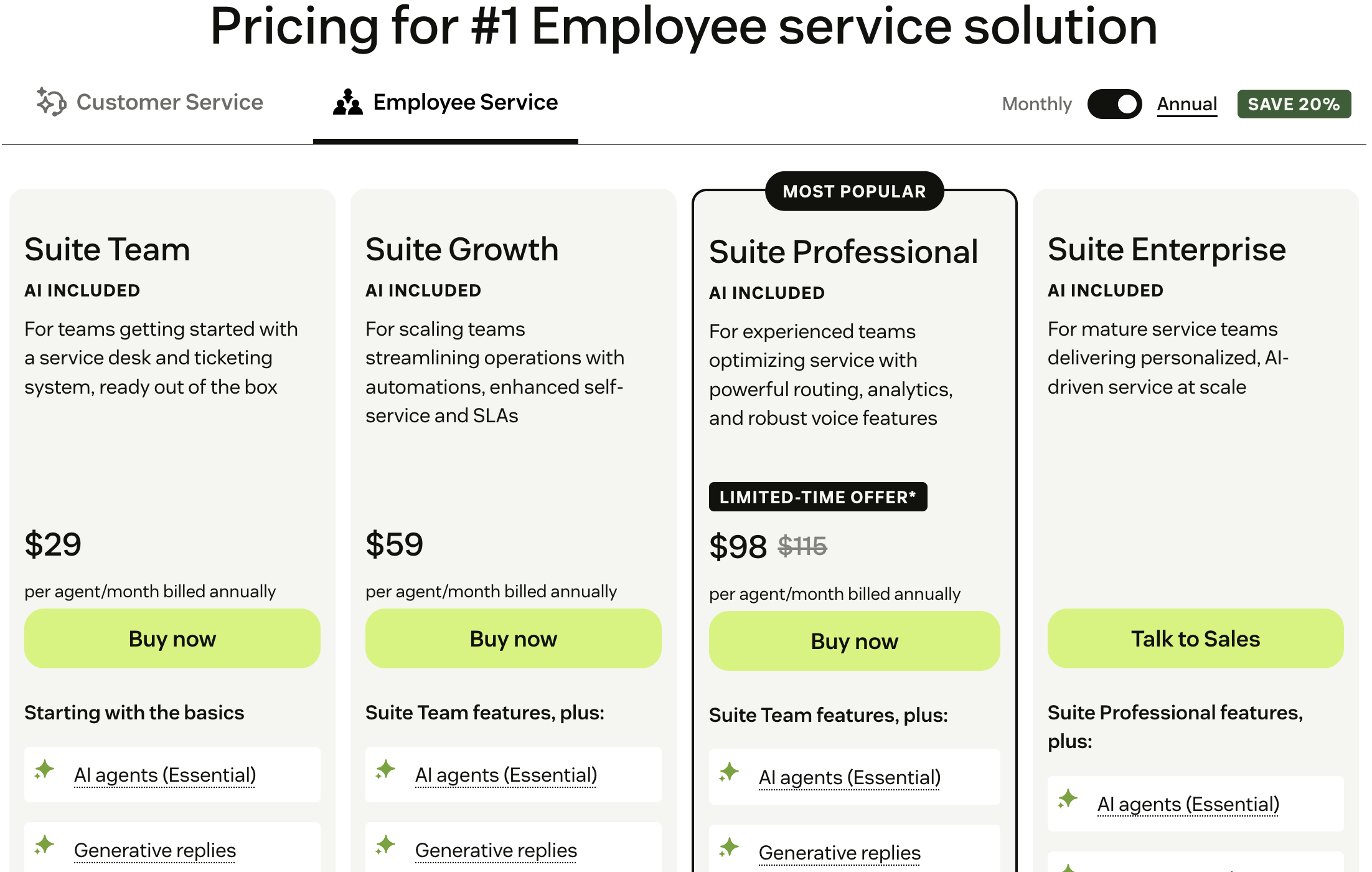 - Employee Service Suite Enterprise: Delivers customized service at scale. Optimizes operations with real-time analytics and some AI-powered suggestions.