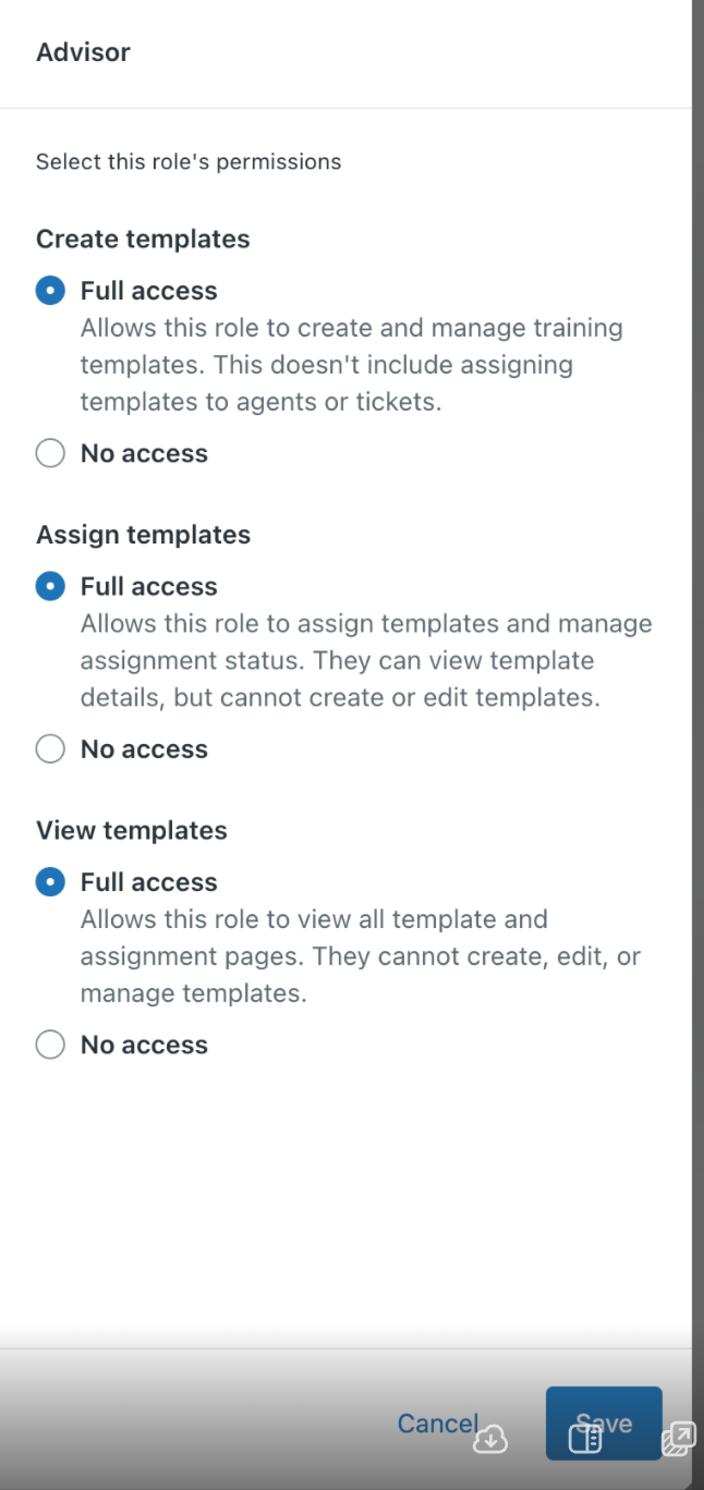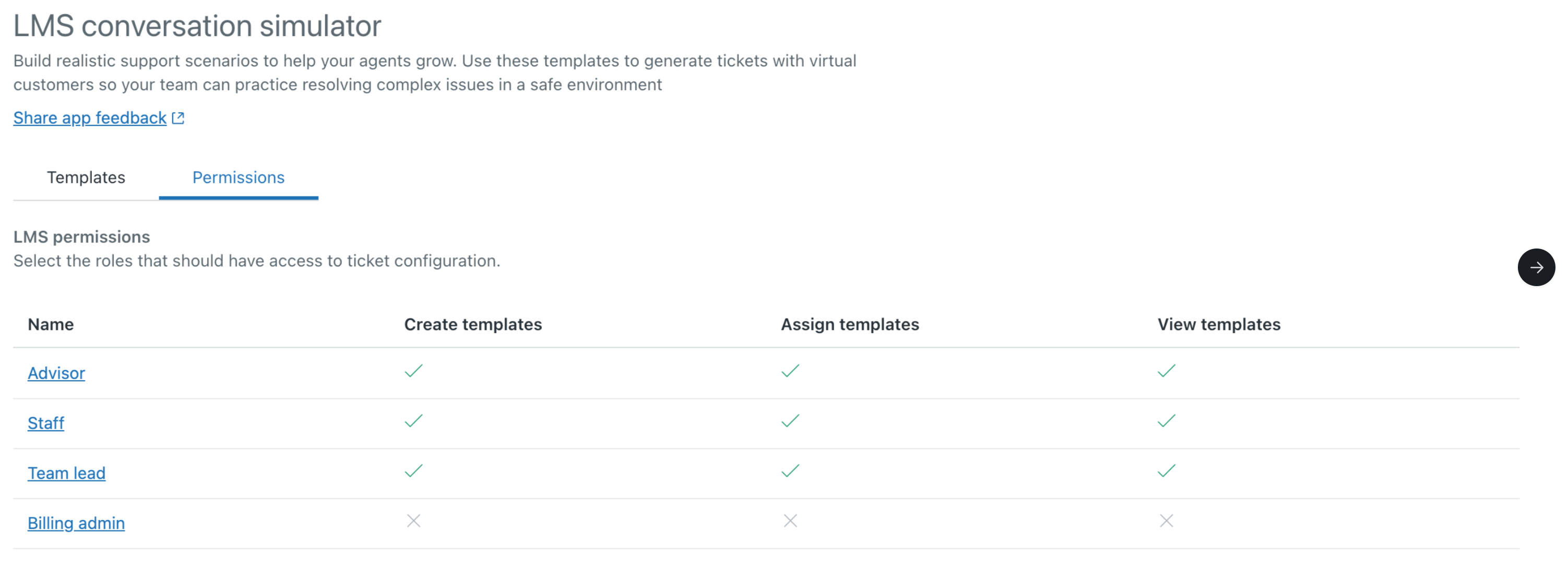 You can select roles from the Permissions tab, allowing non-admin roles to access the app, create templates, and assign training to agents.
