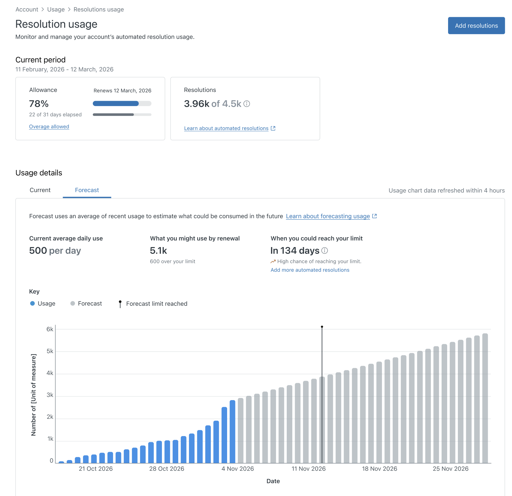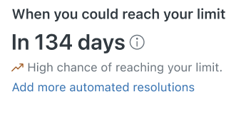- Within the current cycle, we show the date and days until the allowance is reached. If an account is projected to exceed the allowance before renewal, we show an orange indicator “High chance of reaching your limit, add more automated resolutions.”