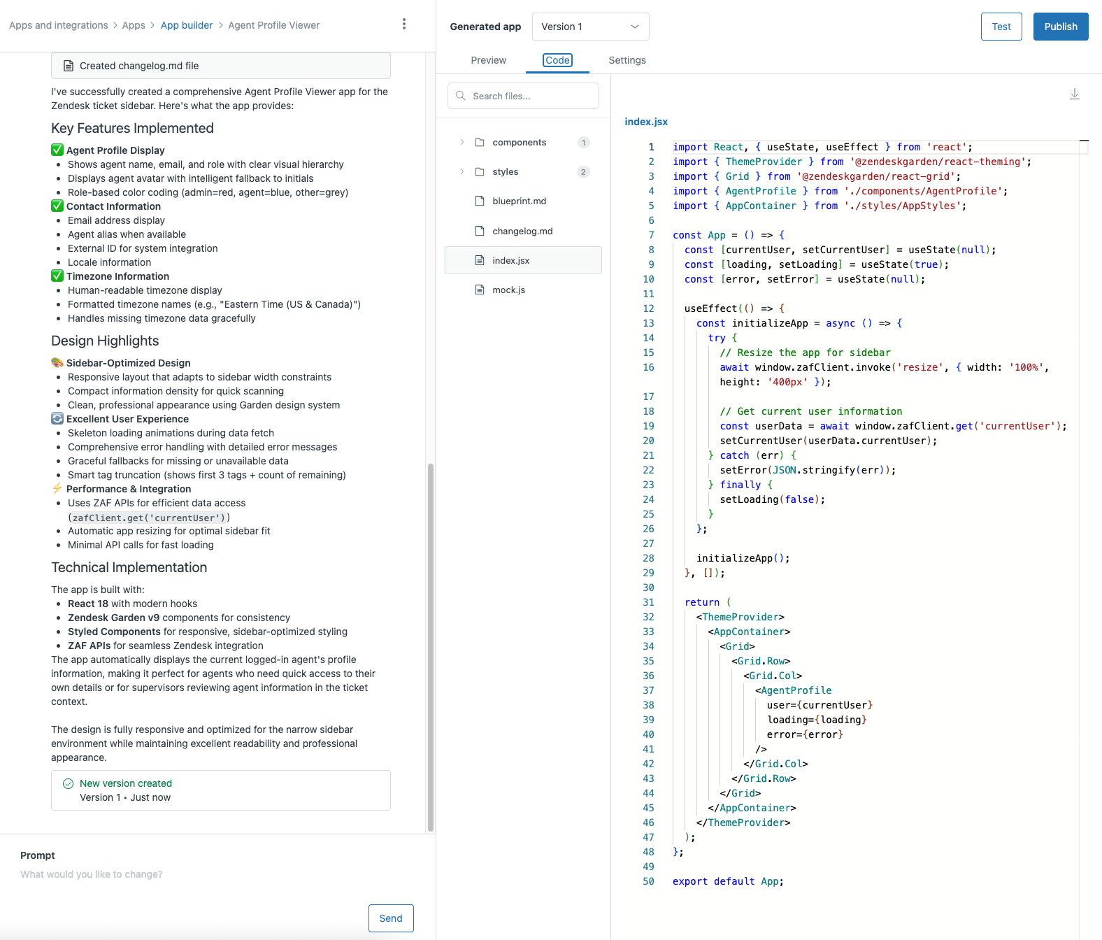 - Zendesk-specific AI expertise: Generate apps using Zendesk frameworks, APIs, and design best practices, and automatically resolve common Zendesk-specific issues.