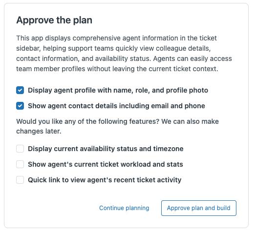 On the “Approve the plan” screen, you’ll see a summary of your app’s proposed functionality, along with core and optional features. Check or uncheck the boxes next to each feature according to your preference. You can continue making changes later so don't worry if you're unsure now. Here's an example: