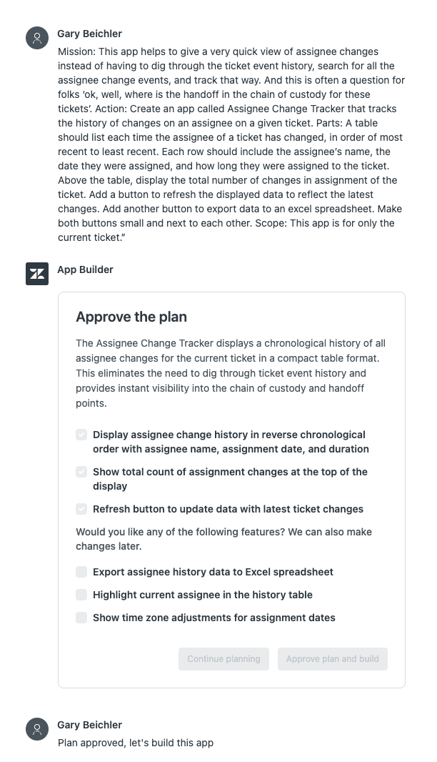 After the AI generates your approved plan, App Builder lets you refine, preview, test, and publish your app directly within your Zendesk account.