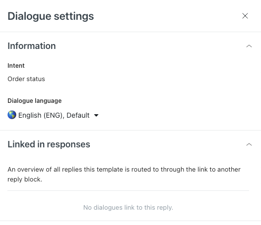 In the dialogue builder, you can view a dialogue's settings. From here, you can change the language of the reply and see where the reply is linked to.