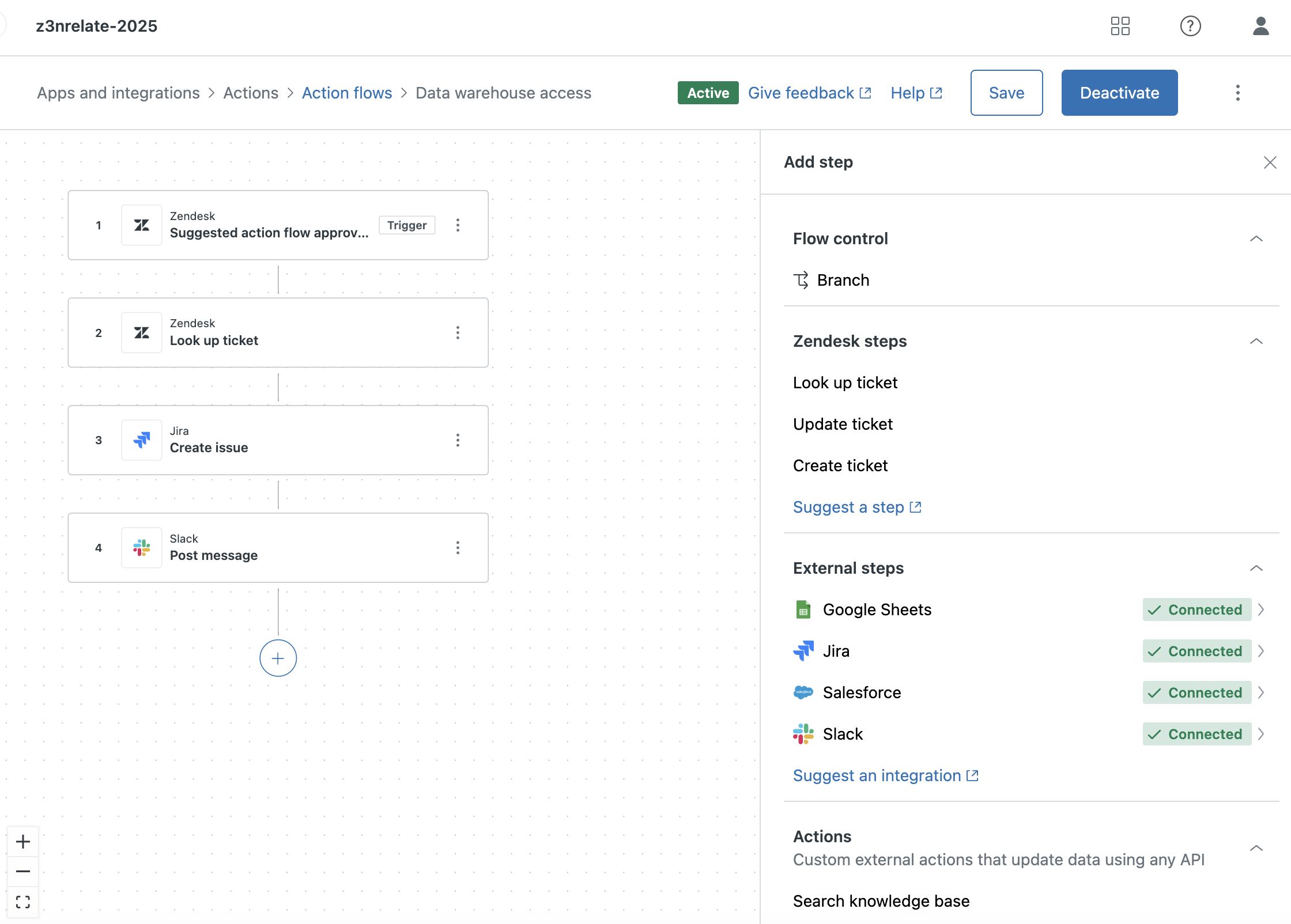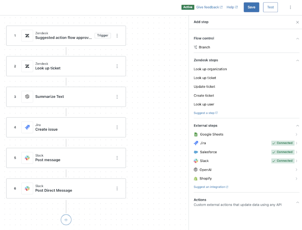- Initiate action flows based on Zendesk events or when an agent approves an agent copilot suggestion.