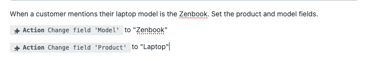 For example, if the parent field in a conditional ticket field is named "Product" and is configured to display the conditional field "Model" when the value "Laptop" is selected. In this case, you should position the action to update the "Model" field before the action to update the "Product" field.