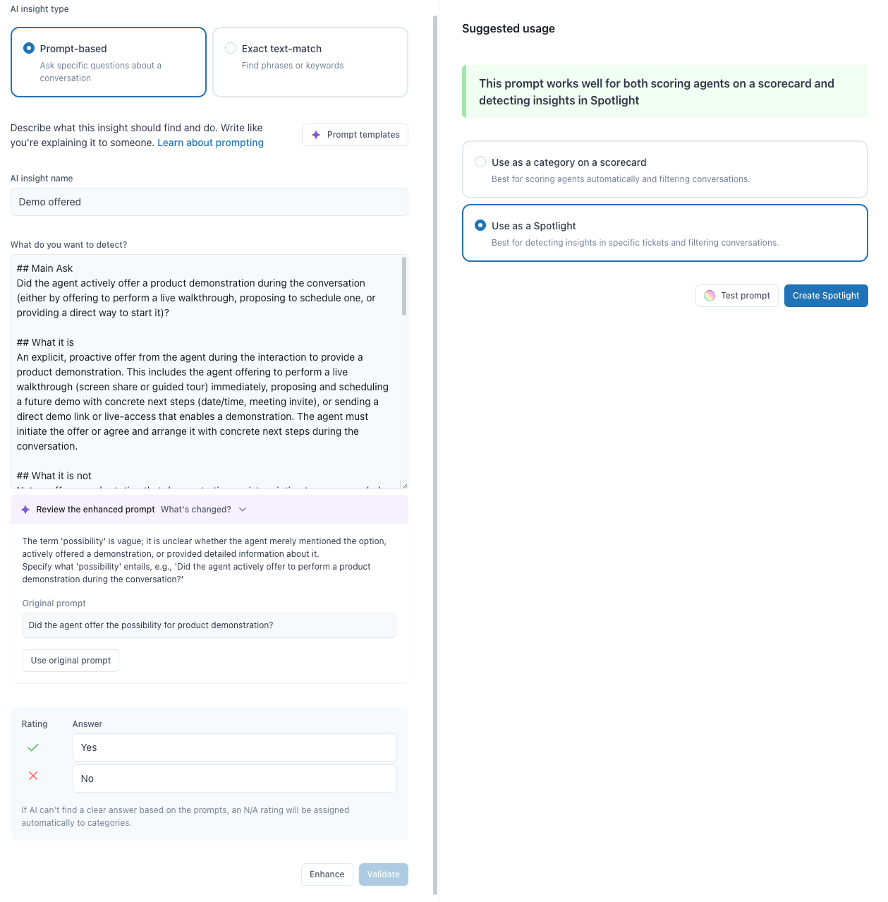 You can create custom AI prompt-based spotlight insights to identify specific behaviors or keywords in conversations and voice transcripts. These insights help flag tickets for further review by detecting agent or customer actions, using AI prompt templates or custom prompts. You can test, validate, and enhance prompts to improve accuracy, with limits on active insights per account. This supports targeted quality assurance and analysis.