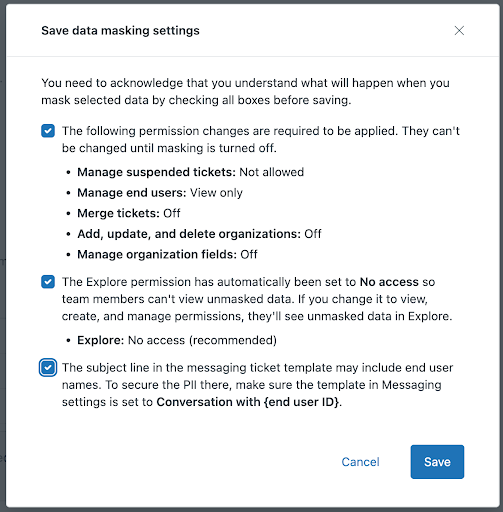 Enable data masking to protect personally identifiable information (PII) by hiding end-user names, phone numbers, and email addresses for agents in custom roles. Before activation, consider role-specific needs and test in a sandbox. You can also remove names from messaging ticket subject lines. Turning off data masking restores access to previously hidden PII. Adjust settings as needed to maintain privacy and compliance.