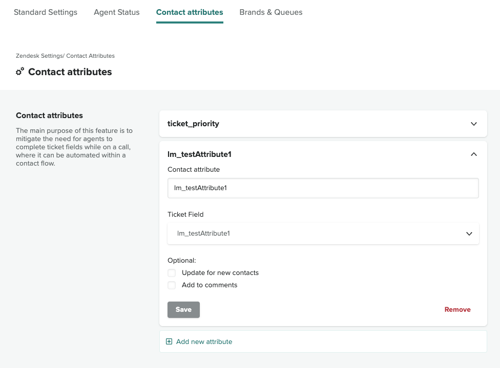 Zendesk settings in the sidebar, then access Standard Settings > Contact attributes. - Click Add new attribute.