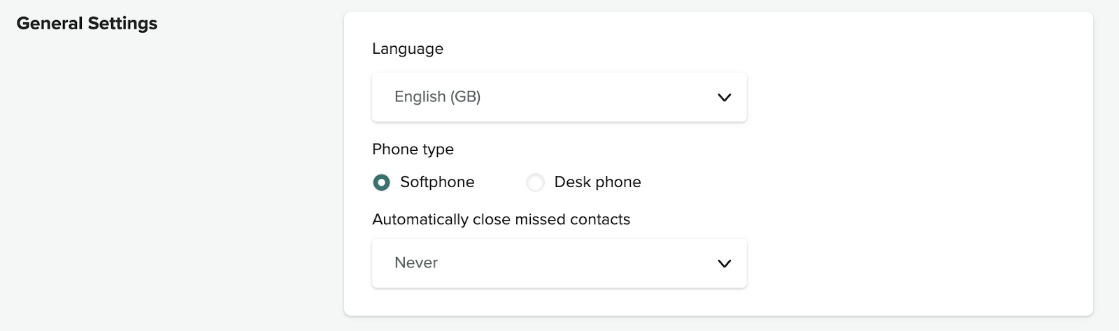 Agents can view agent settings to configure general preferences, such as language and phone type, audio settings, and browser notification settings. Agents using Jabra devices can choose to integrate the call control functionality from their Jabra device into Contact Center.