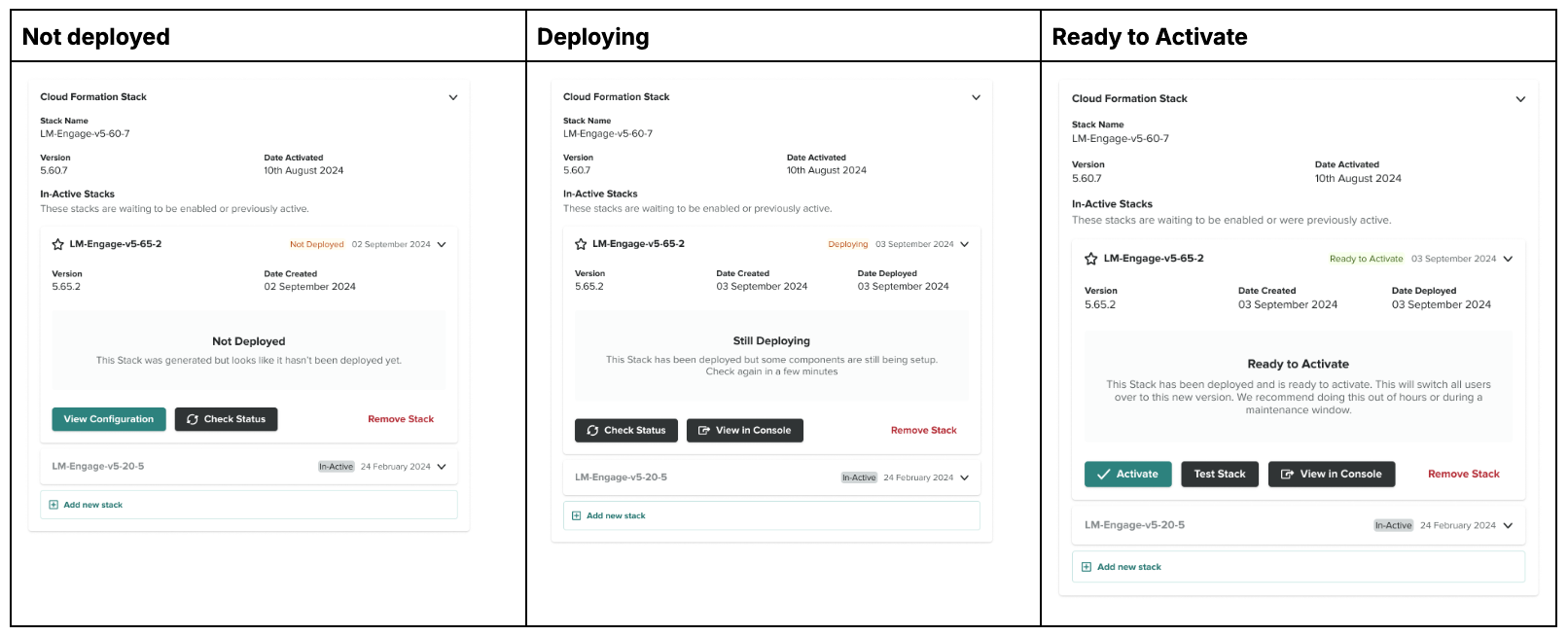 Once the stack begins deployment, it will show in the Still deploying state. While in this state, you can click Check status to check the status of the stack deployment. When it's fully deployed, it will display Ready to activate.