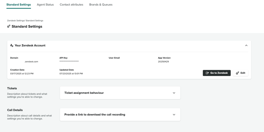 In this section you can review and edit details of the Zendesk integration or click Go to Zendesk to open your linked Zendesk account.
