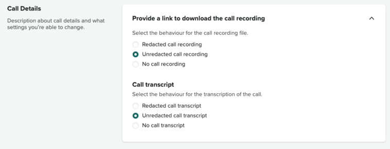 - Unredacted call recording: The entire call recording can be downloaded with no redactions.