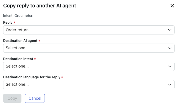 If you've already created a reply, you can copy it to another AI agent to speed up the process of building multiple AI agents. Copying a reply also copies its associated dialogue.