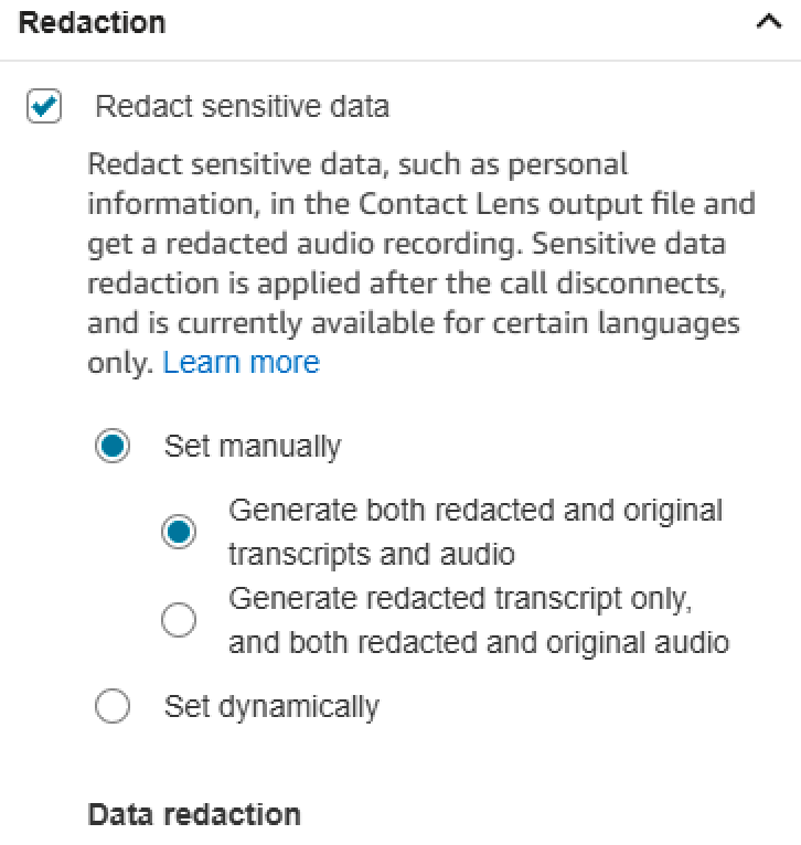 - Under Redaction, select Redact sensitive data and customize the redaction