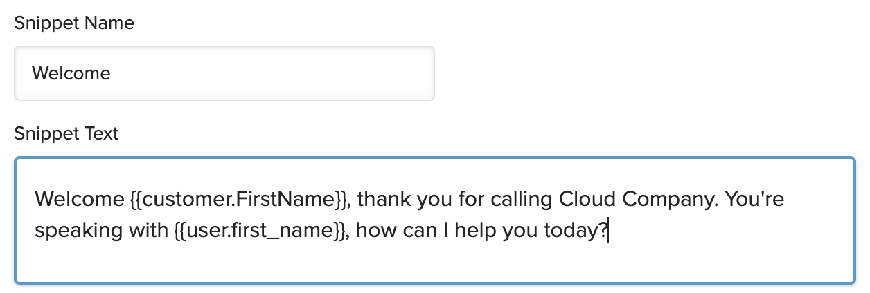 The snippet responses can be customized using personalization tokens to improve customer experience. They can be thought of as placeholders that will be used to include stored attributes such as the customer’s name, phone number, account ID or other information.