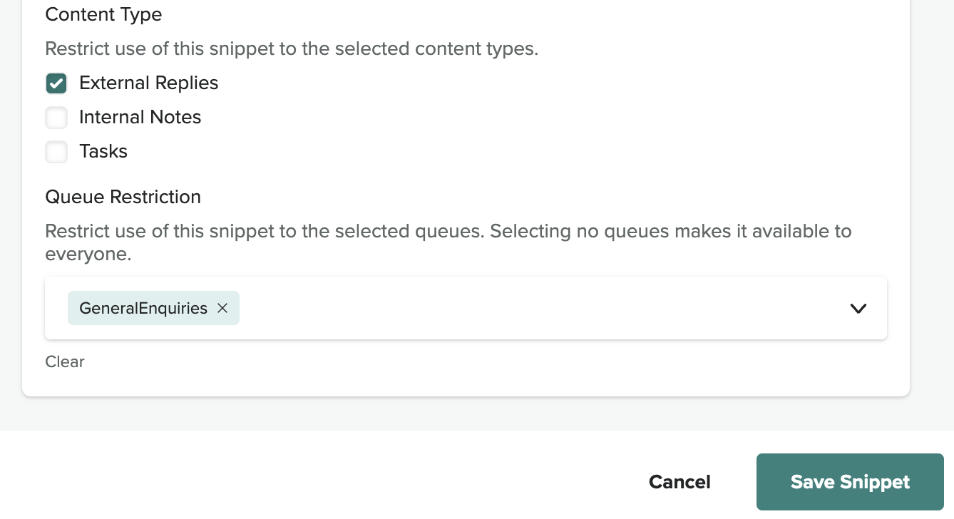- Queue restrictions: This is where you can restrict the use of the snippet to selected queues. If you select no queues, then the snippet is available to everyone.