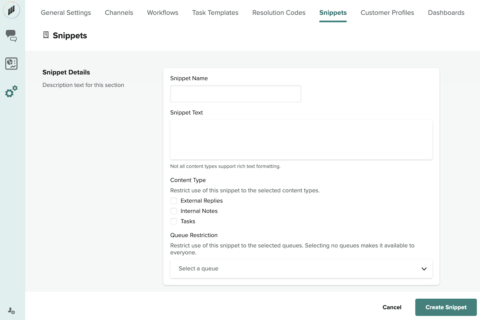 Restrictions limit use of the snippet depending on the case. This can be set under Content Type and Queue Restriction. Limiting the snippets to certain content or queues is helpful for separating and organizing your snippets.