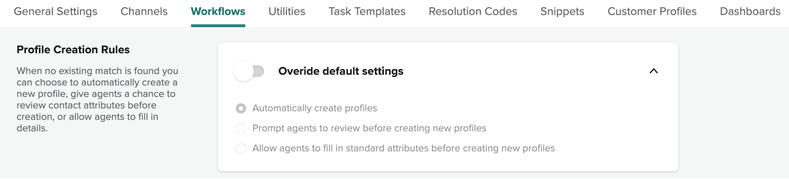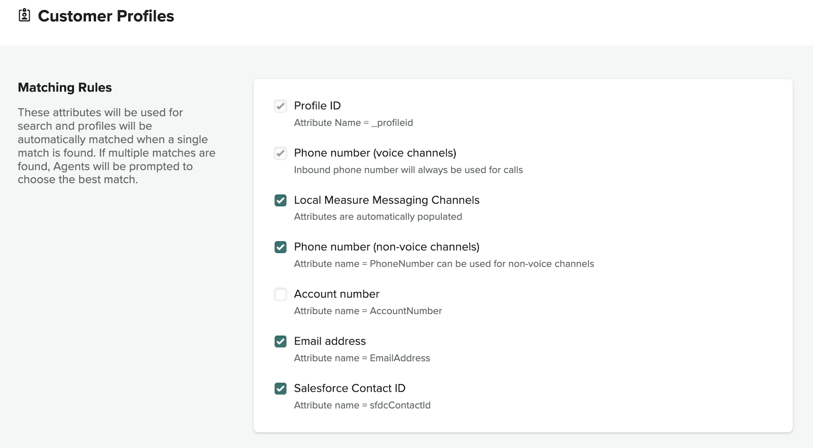 When a contact is routed to an agent, Engage uses specific Contact Attributes to search for an existing profile. Engage will always search for profiles using all of the checked attributes and will not stop after a match is found. If there's a single match, the contact will be automatically associated with that profile, providing the agent with the profile's details and history.