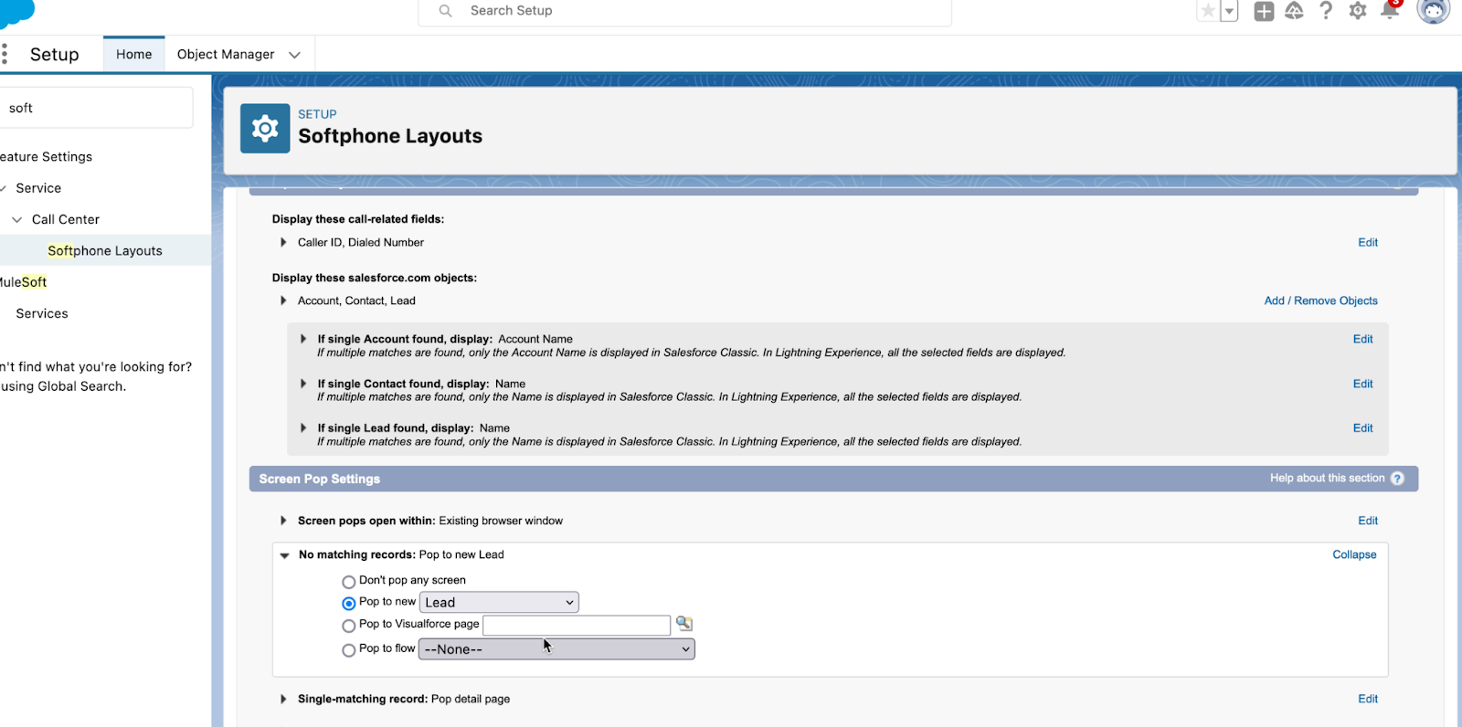 - For No Results Found: Choose the default behaviour or select other options like popping up to a new lead, contact, Visualforcepaget etc. For advanced configurations, opt to redirect to a visual force page or run a specific flow.