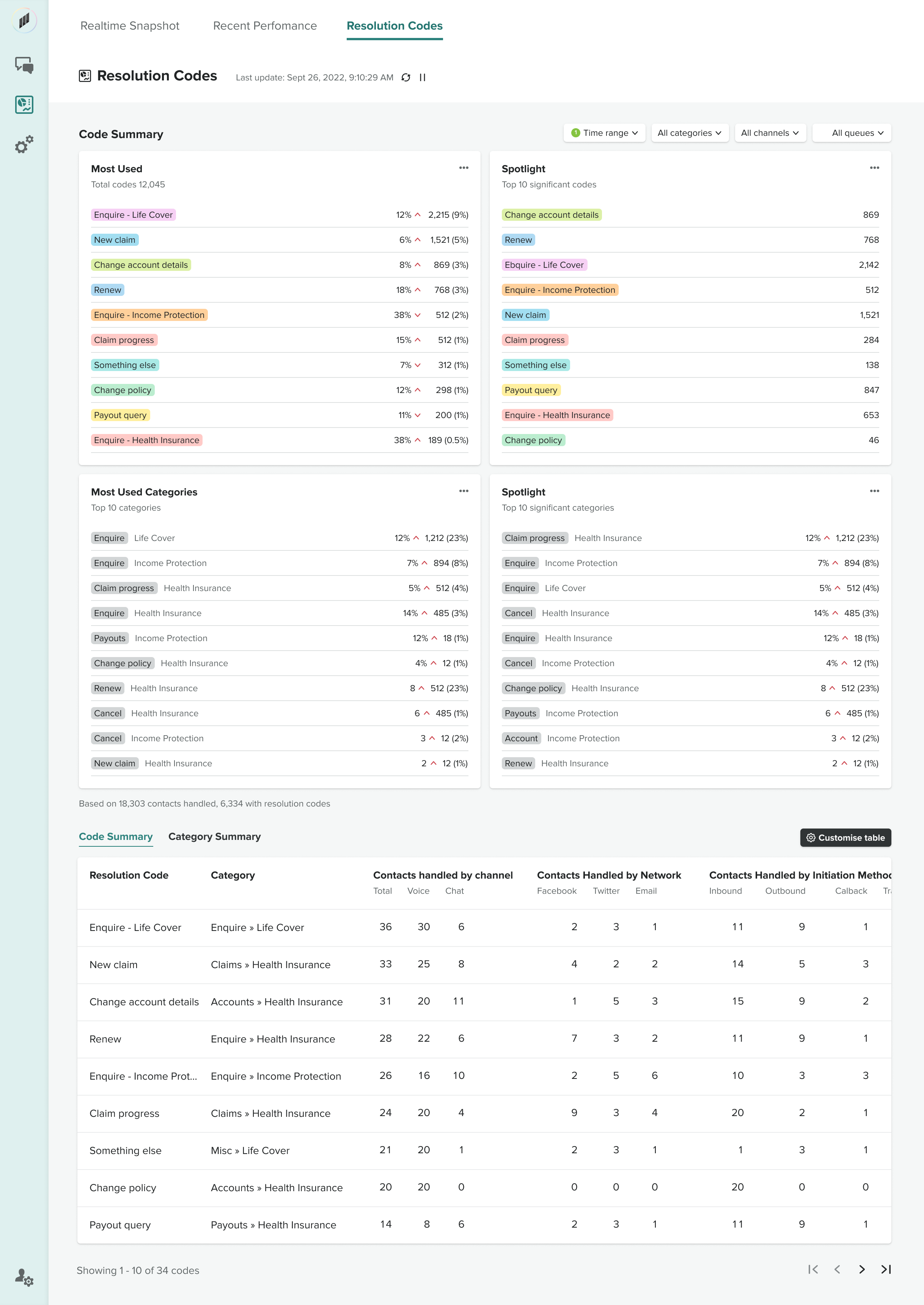 This article outlines the key components of Engage's resolution code dashboard reporting system, detailing metrics related to contact resolutions and their categories. Navigate through to gain insights on the most used resolution codes, variances in usage, and performance breakdowns across multiple communication channels and methods.