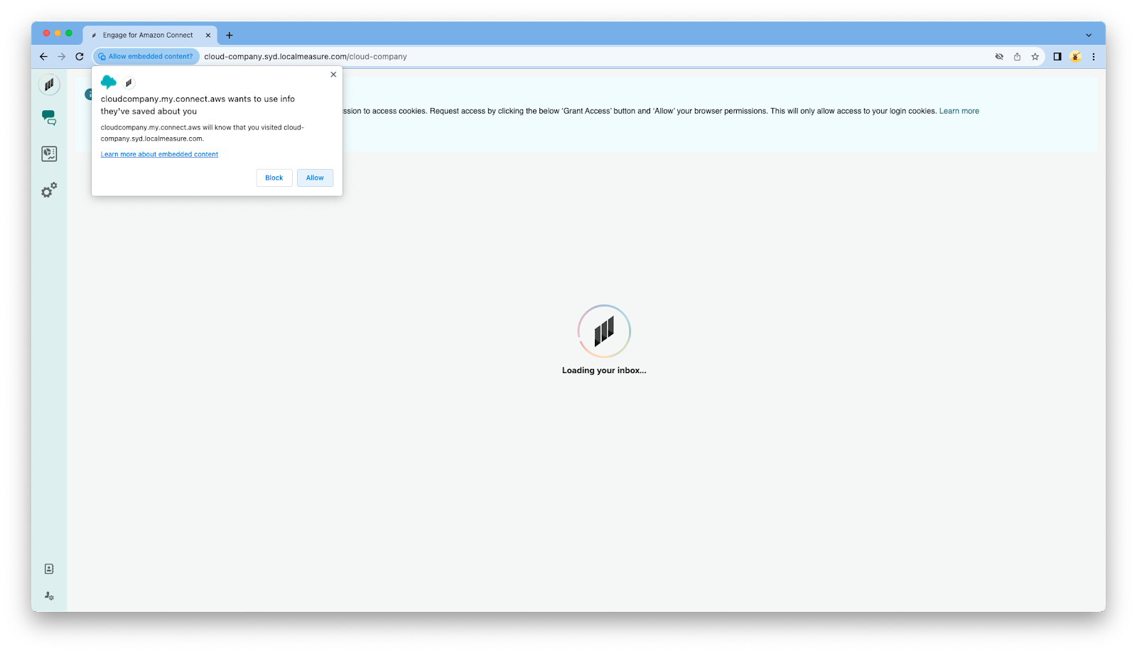 Once 3PC is deprecated for a user, when they log into Engage for the first time post deprecation, they will be prompted to allow access to cookies within their browser. This is necessary to use Engage and Amazon Connect and can be done as per the below: