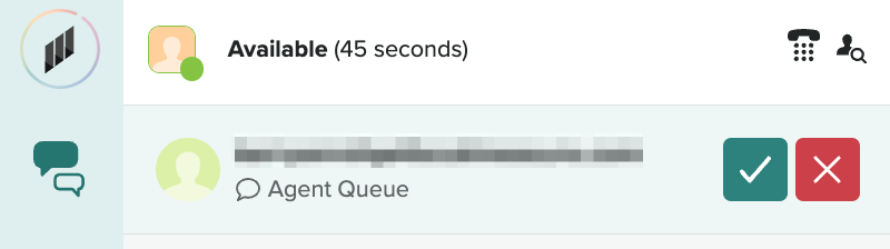 When you receive an incoming call, a ringtone will sound, and a contact will be displayed on your screen with a green tick and a red x. To accept the call, click the green tick. If you decline the call by selecting the red x, it will be automatically passed to the next available agent.