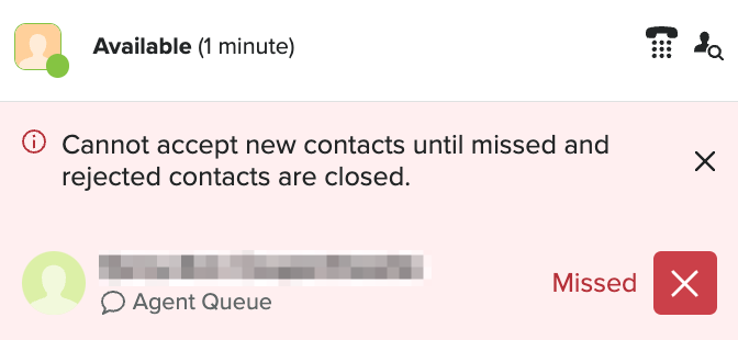 If you don't answer the call, it will be transferred to the next available agent, and you'll receive a "Missed Call" message on your screen. If you aren’t set to automatically clear the Missed interaction status in your Agent settings, you will have to clear the Missed status in order to receive further interactions.