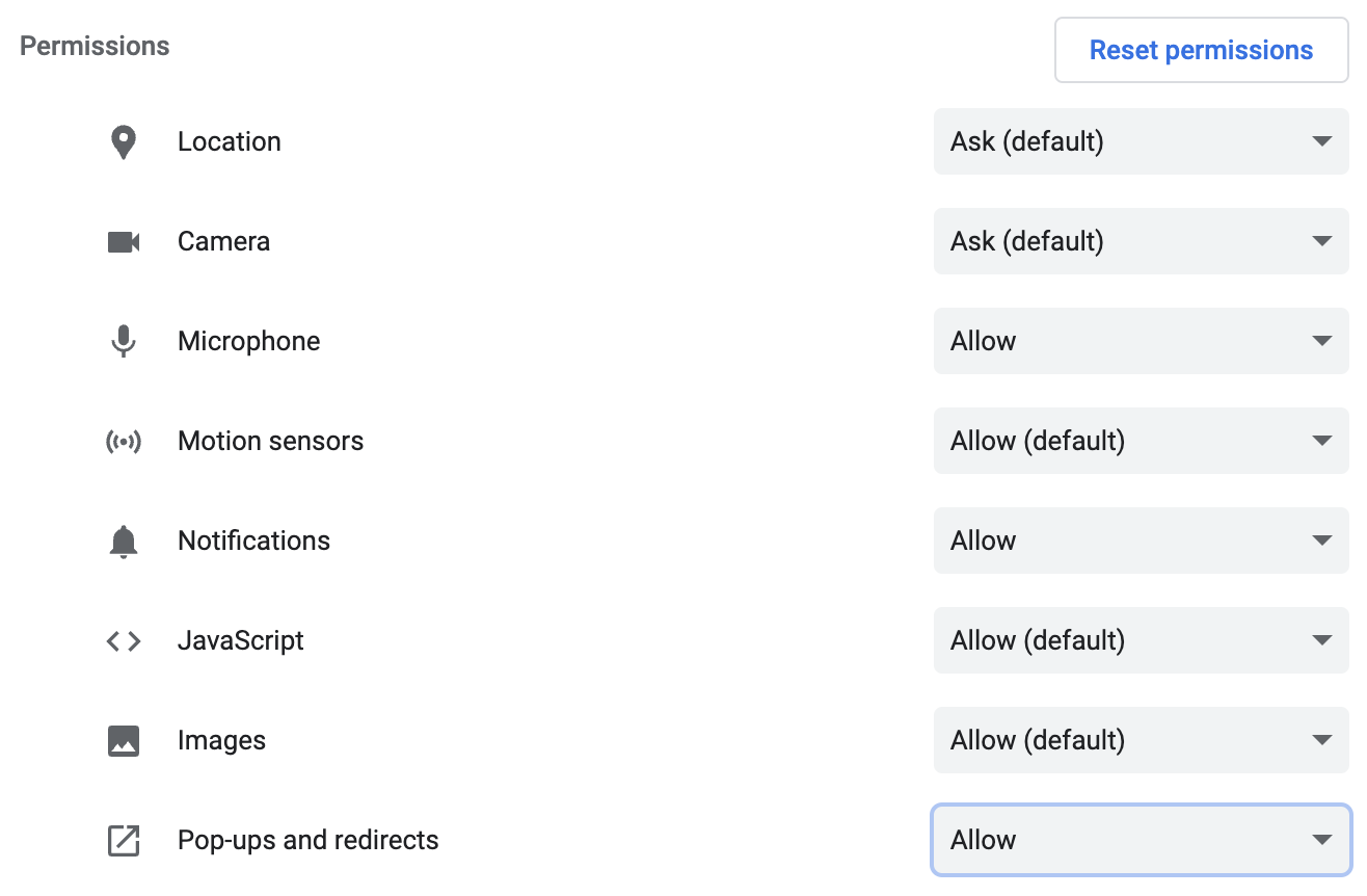 - Click on the menu to access “Microphone” and “Pop-ups and redirects”.