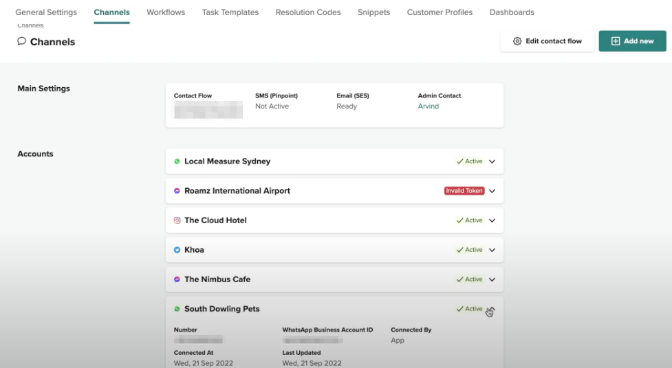 Once linked, return to the Channels screen in Engage Admin Settings and your number will be displayed in the list. You can click on the down arrow to check the details are correctly registered.