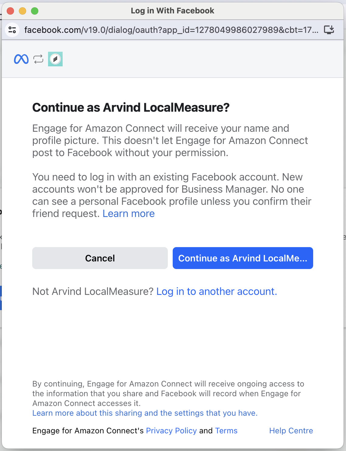 Please ensure you are logged into the Facebook account and have the correct privileges to continue with this process.