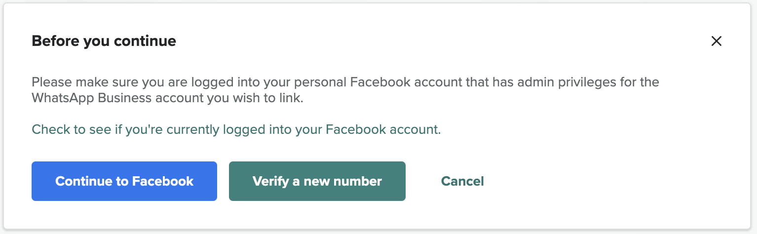 Click on Verify a new number if you want to register and verify a new number to your WhatsApp Business. If you just want to share access to your WABA and link an already verified number, click on the Continue to Facebook button.